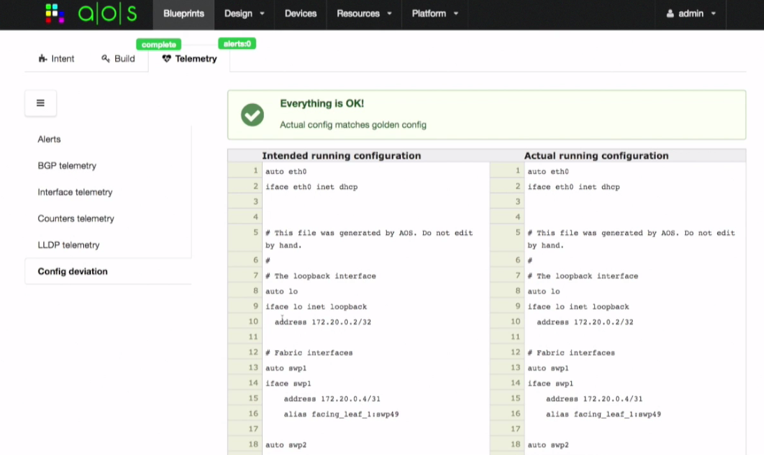 This means that AOS knows what the network is supposed to be like, and this is the context that Derick referred to. This implies there is either a large number of build templates that comes with AOS, or I’ll be spending a lot of time configuring my own. Maybe I need to stop configuring snowflakes, but as the platform matures, I wonder how the AOS intent-engine will reconcile and validate built-in templates with custom configurations.