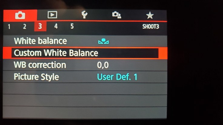 Now, go into your camera settings for white balance and set it to custom. It should prompt you to choose an image as your custom reference, which in our case is the picture we just took. In my camera, I go to the main camera menu, then select Custom White Balance, then it prompts me to choose a picture.