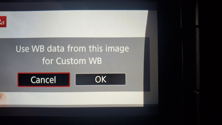 It then explicitly asks if I want to use data from that image for Custom white balance. I select OK which makes it the new reference for the camera to automatically adjust the white balance. Now it will use this as the reference image for pure white and automatically adjust reds, greens, and blues accordingly.
