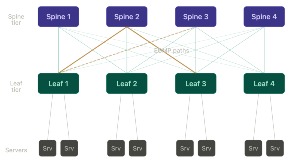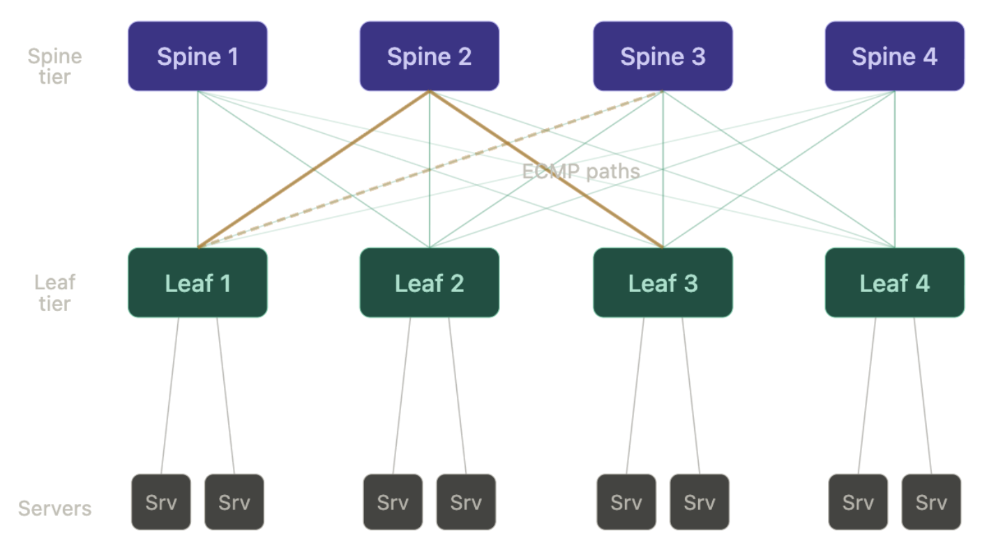 This design has several architectural advantages. First, it’s relatively easy to operate. The topology is regular and repeatable, which makes it easy to deploy and scale. Need more capacity? Add more spine switches. Need more server ports? Add more leaf switches and scale the spine layer accordingly.