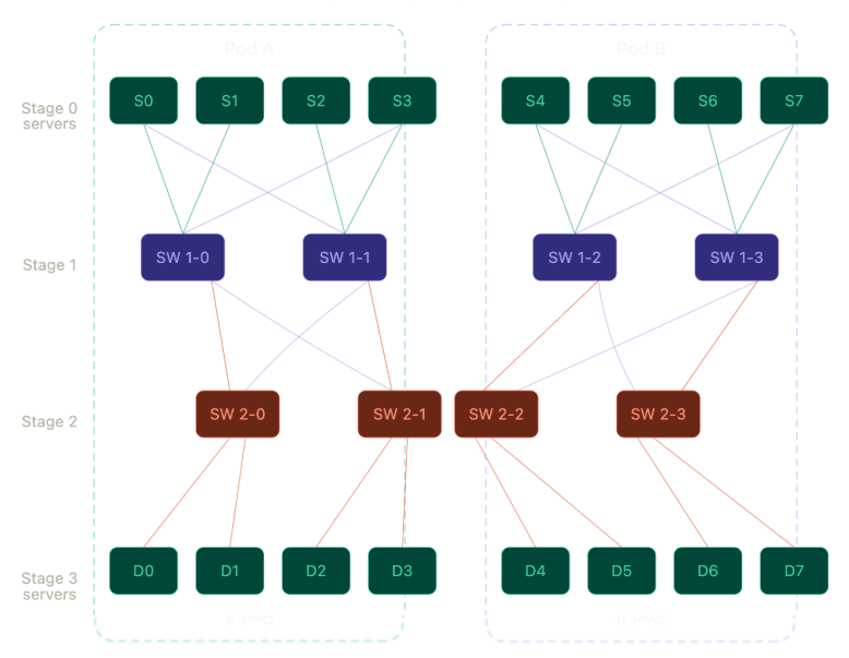 Butterfly fabrics take a more structured and deterministic approach to connectivity. A butterfly network is a multi-stage topology where each stage performs a specific transformation on the path toward the destination. Instead of every node connecting uniformly to a central spine layer, nodes are connected through a sequence of switching stages that systematically route traffic using predefined patterns. The topology is often described in terms of stages and dimensions, with each stage reducing the “distance” to the destination based on address transformations.